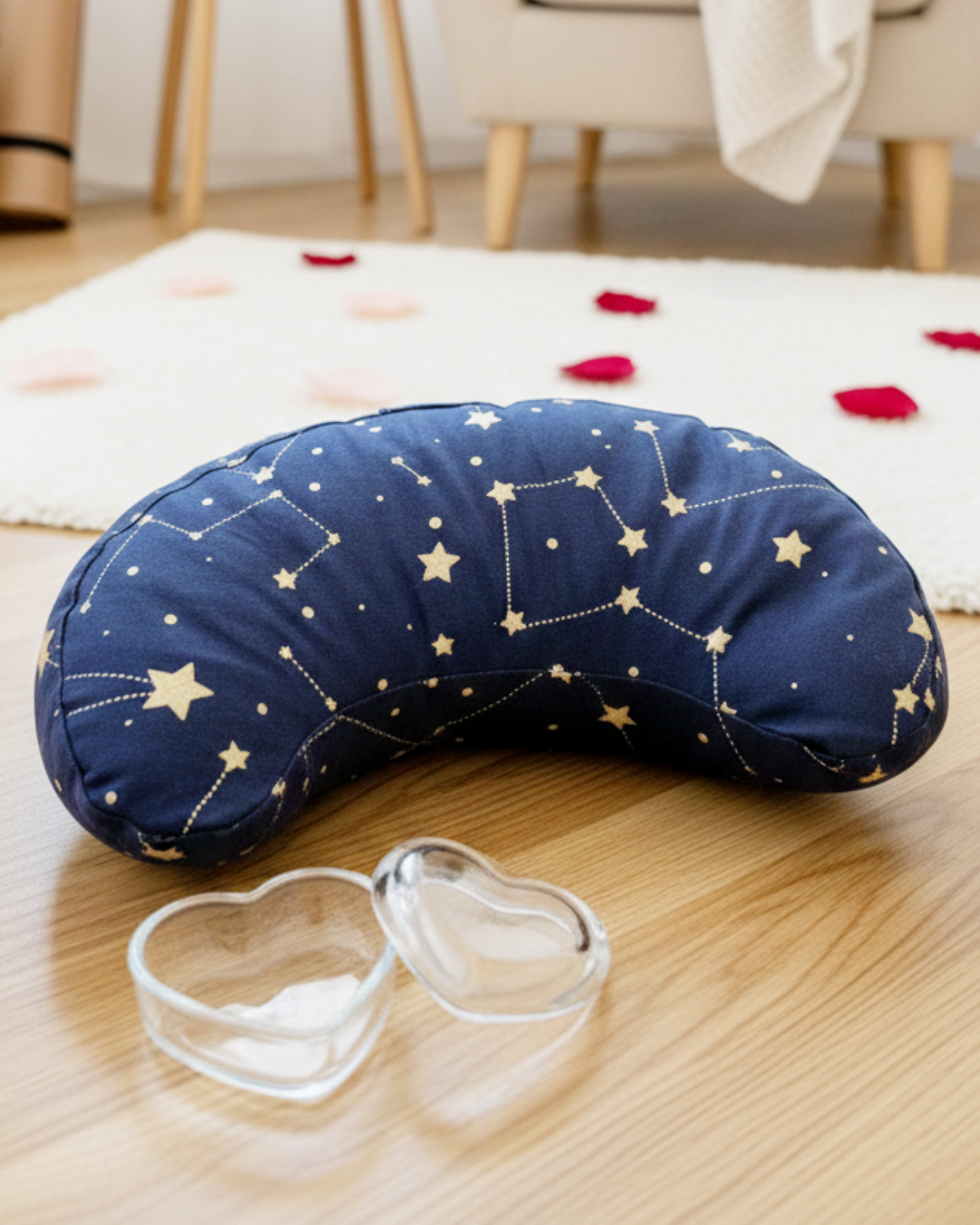 - einem PURE SHANTI Halbmondkissen in Dunkelblau mit stilvollem Sternenhimmel-Design
